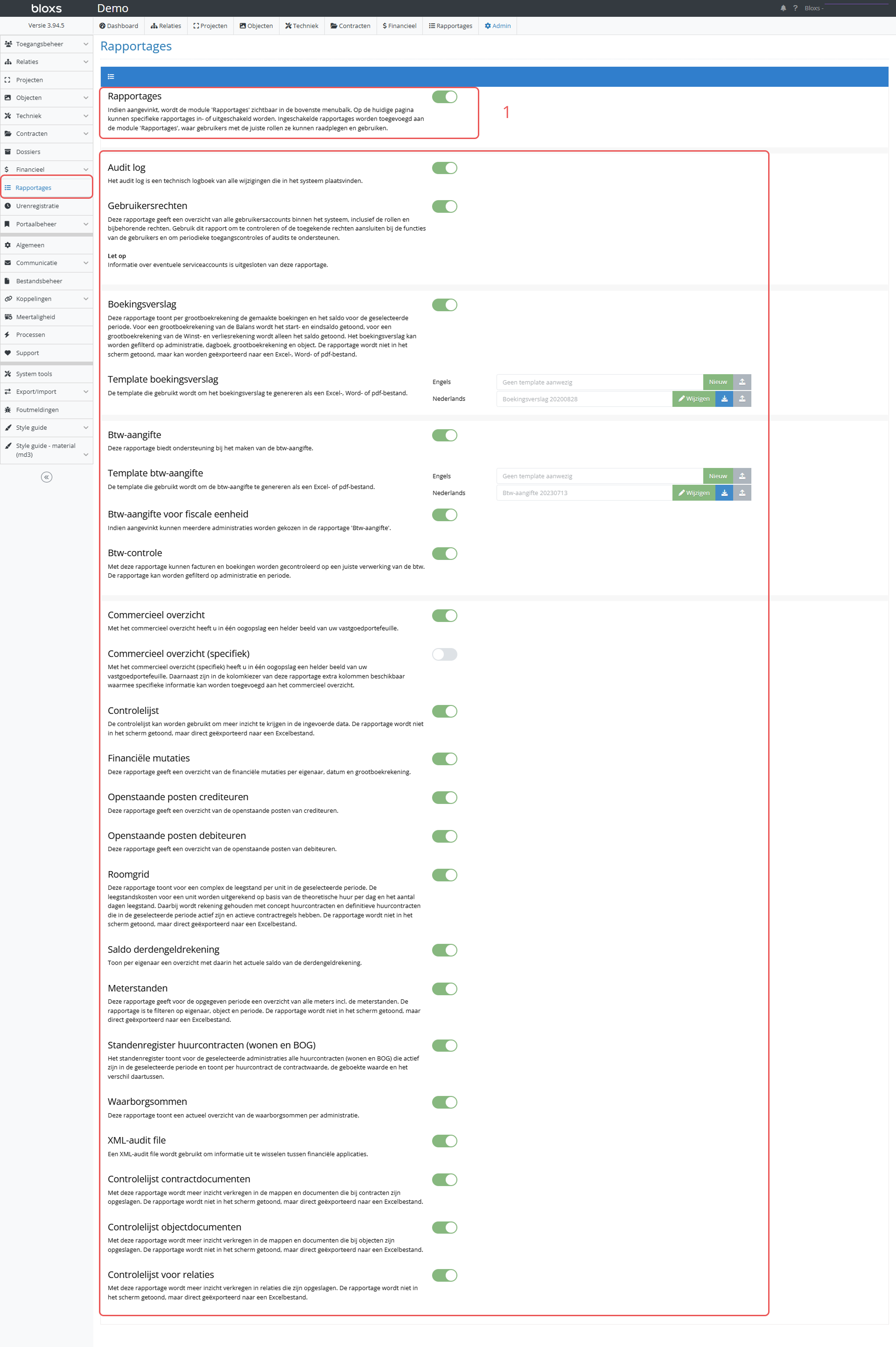 Door het aanzetten van deze optie kunt u gebruik maken van rapportages. Na het aanzetten van deze optie wordt de module 'Rapportages' getoond in de bovenste menubalk.